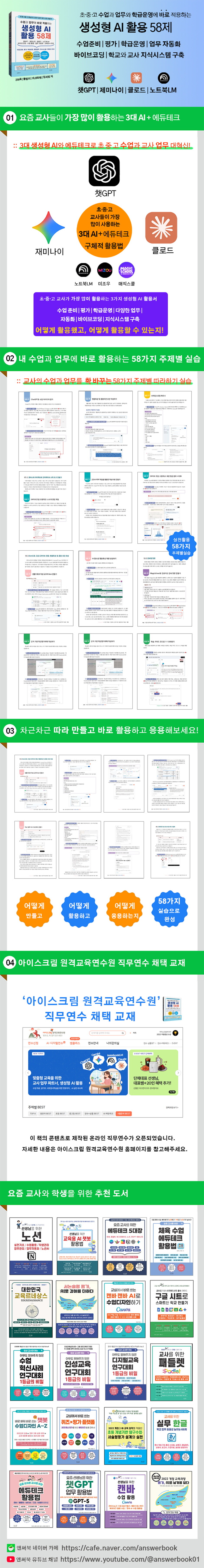Ã¥Àº ¼ö¾÷ ÁغñºÎÅÍ Æò°¡, ÇÐ±Þ ¿î¿µ, »ýȰ±â·ÏºÎ ÀÛ¼º, ÇàÁ¤ ¾÷¹« ÀÚµ¿È, ±³À°¿ë AI 꺿 ¼³°è±îÁö ±³»çÀÇ ½ÇÁ¦ ¾÷¹«¿Í ¼ö¾÷¿¡ ¹Ù·Î Àû¿ëÇÒ ¼ö ÀÖ´Â »ý¼ºÇü AI Ȱ¿ë ¹æ¹ýÀ» ¹ÙÀ̺êÄÚµù »ç·Ê¸¦ Æ÷ÇÔÇØ 58°³ÀÇ ½ÇÀü ¿¹Á¦·Î µû¶óÇϱ⠽±°Ô Á¤¸®ÇÑ Ã¥ÀÔ´Ï´Ù.