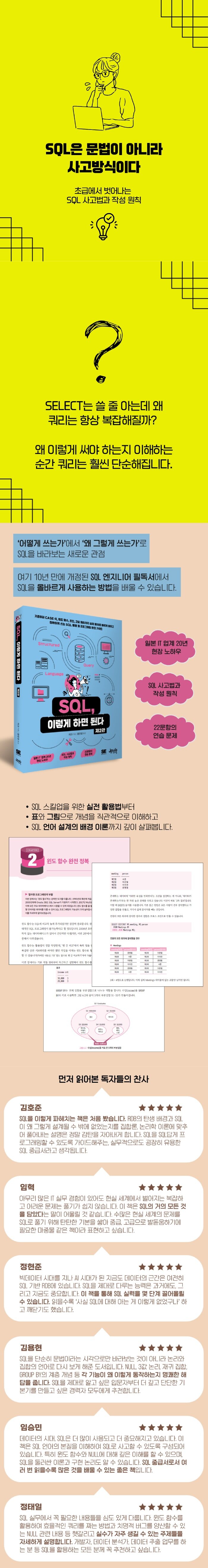 10³â ¸¸¿¡ °³Á¤µÈ SQL ¿£Áö´Ï¾îµéÀÇ Çʵ¶¼·Î¼ SQLÀ» ¿Ã¹Ù¸£°Ô »ç¿ëÇÏ´Â ¹æ¹ý°ú ÇÙ½É »ç°í¹æ½ÄÀ» ÇØ¼³Çϴ åÀÌ´Ù. ÃÊÆÇ ±¸¼ºÀ» »ì¸®¸é¼µµ SQLÀÇ °·ÂÇÑ ±â´ÉÀÎ À©µµ ÇÔ¼ö¸¦ Àü¸éÀûÀ¸·Î ä¿ëÇÏ´Â µî °ÅÀÇ ¸ðµç ÄÚµå¿Í ÇØ¼³À» Ãֽг»¿ëÀ¸·Î °³Á¤Çß´Ù. Æø³ÐÀº DBMS¸¦ ´Ù·ç¸ç ºòµ¥ÀÌÅÍ ½Ã´ë SQLÀ» ´Ù·ç´Â ¿£Áö´Ï¾î¿¡ ÇÊ¿äÇÑ ¸ð´øÇÑ SQL ±â´ÉÀ» ±¸»çÇÏ´Â ¹æ¹ýÀ» »ìÆìº»´Ù. ³ª¾Æ°¡ SQLÀÇ ¿ø¸®°¡ µÇ´Â ±¸Á¶¿Í ¾ð¾î ¼³°èÀÇ ¹è°æÀ» ¤À¸¸ç, ¾î¶² Àǵµ¿Í ÆÇ´ÜÀ¸·Î ÇöÀçÀÇ SQL ¹®¹ý°ú ±â´ÉÀÌ ±¸¼ºµÇ¾ú´ÂÁö±îÁö ±íÀÌ ÀÖ°Ô ¼³¸íÇÑ´Ù.