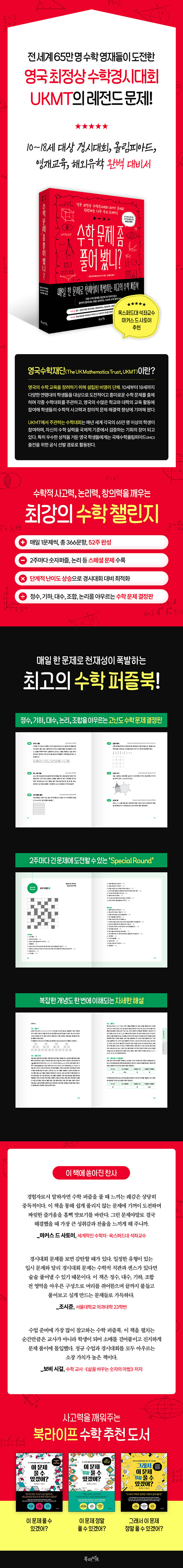¼¼°èÀûÀÎ ¼öÇаæ½Ã´ëȸ¸¦ ÁÖ°üÇÏ¸ç ¼öÇÐ ±³À°°ú ¿µÀç ¹ß±¼À» ¼±µµÇØ ¿Â ¿µ±¹¼öÇÐÀç´Ü(UKMT)ÀÌ »ç°í·Â°ú âÀÇ·ÂÀ» ±ú¿ì´Â ¹®Á¦µéÀ» ¾ö¼±ÇØ Ã¥ ¡¶¼öÇÐ ¹®Á¦ Á» Ç®¾î ºÃ´Ï?¡··Î ¿«¾ú´Ù. ¿Á½ºÆÛµå´ë ¼®Á±³¼öÀÌÀÚ ¼¼°èÀûÀÎ ¼öÇÐÀÚ ¸¶Ä¿½º µå »çÅäÀÌ´Â ÀÌ Ã¥¿¡ ¼ö·ÏµÈ ¹®Á¦¿¡ ´ëÇØ ¡°¼öÇÐÀÇ º»Áú°ú Áñ°Å¿òÀ» °æÇèÇÏ°Ô ÇØÁØ´Ù.¡±¶ó°í ±ØÂùÇß´Ù.
