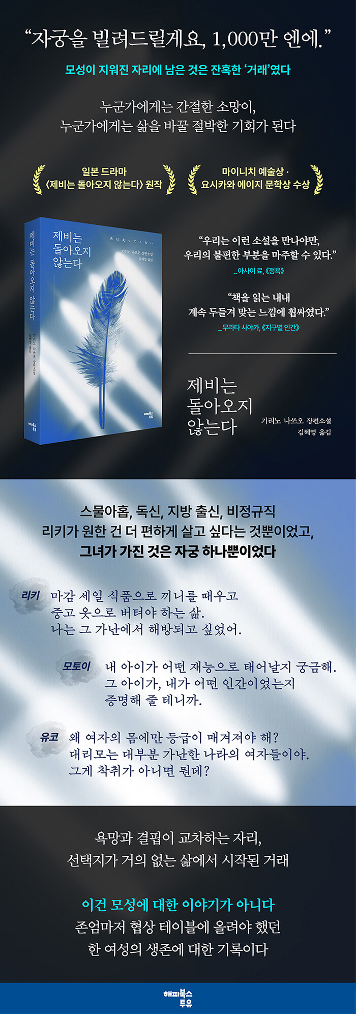 ÀÛ°¡´Â ´ë¸® Ãâ»êÀ̶ó´Â ¹Î°¨ÇÑ ¼ÒÀ縦 ÅëÇØ ´©±º°¡¿¡°Ô´Â »îÀ» À̾±â À§ÇÑ À¯ÀÏÇÑ ±âȸ°¡ µÇ°í, ¶Ç ´Ù¸¥ ´©±º°¡¿¡°Ô´Â ¿å¸ÁÀ» ½ÇÇöÇÏ´Â ¼ö´ÜÀÌ µÇ´Â Çö½ÇÀ» ºñÃá´Ù. ±× »çÀÌ¿¡¼ Àΰ£ÀÇ ¸ö°ú »îÀº Á¡Á¡ ´õ º¹ÀâÇÑ °Å·¡ÀÇ ±¸Á¶ ¼ÓÀ¸·Î ½º¸çµç´Ù.
