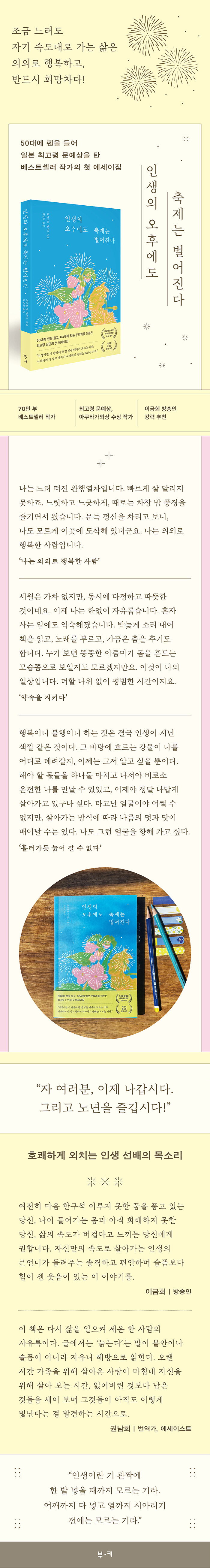 ¿ÍīŸÄÉ Ä¡»çÄÚÀÇ Ã¹ ¿¡¼¼ÀÌÁý ¡ºÀλýÀÇ ¿ÀÈÄ¿¡µµ ÃàÁ¦´Â ¹ú¾îÁø´Ù¡»´Â Àڱ⸸ÀÇ ¼Óµµ·Î ÀλýÀ» »ì¾Æ°¡´Ù ÃàÁ¦ °°Àº ¼ø°£À» ¸¸³ª°Ô µÈ ÇÑ »ç¶÷ÀÇ À̾߱âÀÌÀÚ, ¡°ÀÚ ¿©·¯ºÐ, ÀÌÁ¦ ³ª°©½Ã´Ù. ±×¸®°í ³ë³âÀ» Áñ±é½Ã´Ù¡± È£ÄèÇÏ°Ô ¿ÜÄ¡´Â Àλý ¼±¹èÀÇ ¸ñ¼Ò¸®´Ù. ¡°¿©ÀüÈ÷ ¸¶À½ Çѱ¸¼® ÀÌ·çÁö ¸øÇÑ ²ÞÀ» ǰ°í ÀÖ´Â ´ç½Å, ³ªÀÌ µé¾î°¡´Â ¸ö°ú ¾ÆÁ÷ ÈÇØÇÏÁö ¸øÇÑ ´ç½Å, »îÀÇ ¼Óµµ°¡ ¹ö°Ì´Ù°í ´À³¢´Â ´ç½Å¿¡°Ô¡±(À̱ÝÈñ ¹æ¼ÛÀÎ) ÀÌ Ã¥À» ±ÇÇÑ´Ù.