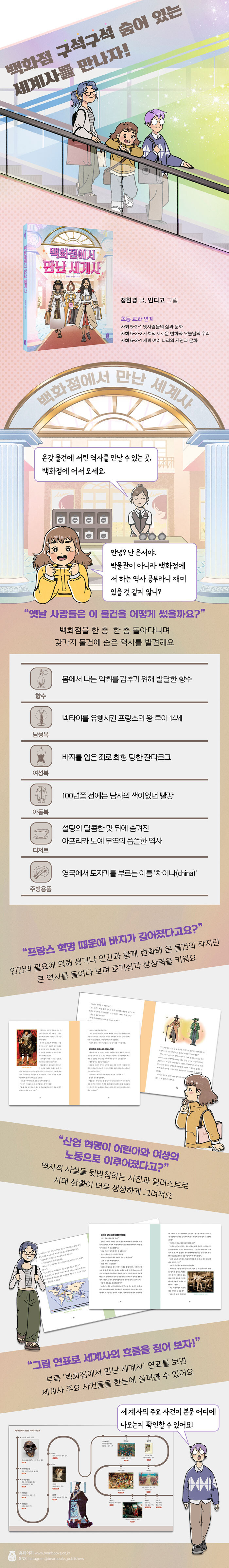 ¡¶¹éÈÁ¡¿¡¼ ¸¸³ª´Â ¼¼°è»ç¡·´Â ¹éÈÁ¡¿¡ Áø¿µÈ ¿Â°® ¹°°Ç¿¡ ¾ôÈù ÀÛÀº ¿ª»ç¸¦ µé¿©´Ùº¸¸ç ±× ³Ê¸Ó¿¡ ÀÖ´Â ¼¼°è»ç¶ó´Â Å« È帧¿¡ ´Ù°¡°¡´Â ¾î¸°ÀÌ ±³¾ç¼ÀÔ´Ï´Ù. ÀÌ Ã¥Àº ÃʵîÇб³ 4Çгâ Àº¼°¡ ÁßÇб³¿¡¼ ¿ª»ç¸¦ °¡¸£Ä¡´Â À̸ð, ¿ª»ç ÇеµÀÎ »çÃÌ ¿Àºü Çö¼ö¿Í ÇÔ²² ¹éÈÁ¡¿¡ °¡¸é¼ ½ÃÀ۵˴ϴÙ. ¼¼ »ç¶÷Àº ¹éÈÁ¡À» ÇÑ Ãþ ÇÑ Ãþ µÑ·¯º¸¸ç Çâ¼ö, ÈÀåǰ, ³²¼ºº¹, ¿©¼ºº¹, ¾Æµ¿¿ëǰ, À½½Ä°ú µðÀúÆ®, ½ºÆ÷Ã÷¿ëǰ, ½Ä±â¿Í °¡ÀüÁ¦Ç°¿¡ À̸£±â±îÁö Å©°í ÀÛÀº ¹°°Ç¿¡ ¾ôÈù ¿ª»çÀû »ç°Ç°ú Àι°¿¡ ´ëÇØ À̾߱⸦ ³ª´©Áö¿ä. °í´ëºÎÅÍ Çö´ë±îÁö, µ¿¾ç¿¡¼ ¼¾ç±îÁö ½Ã°£°ú °ø°£À» ³Ñ³ªµé¸é¼ ¸»ÀÔ´Ï´Ù.