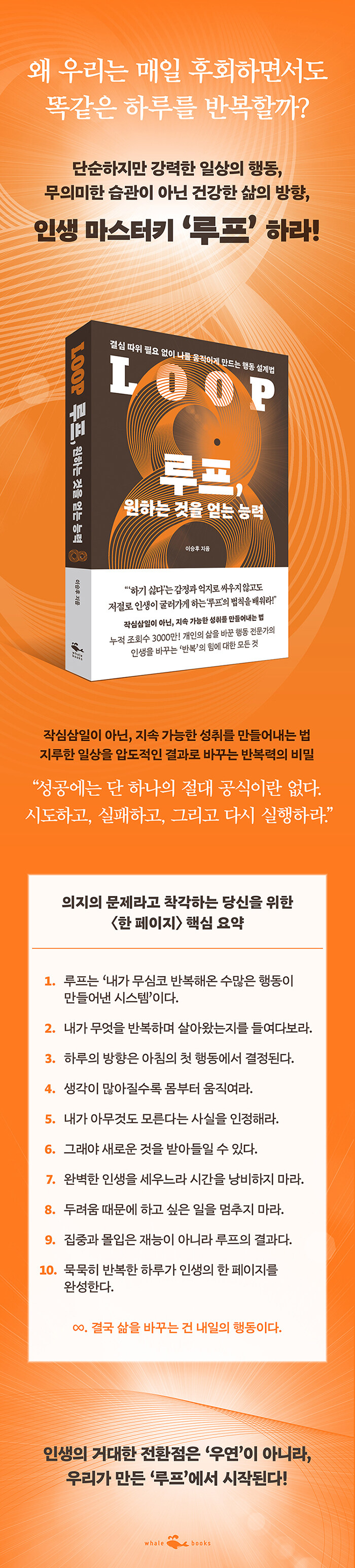 À¯Æ©ºê ¡®·çÇÁ·¦¡¯°ú ¡®¿ì¸® ¸ðµÎ ưư¡¯ ä³Î¿¡¼ »ç¶÷µéÀÇ Çൿ ½À°ü°ú »ýȰ ŵµ¸¦ ´Ù·ç¸ç ´©Àû Á¶È¸¼ö 3000¸¸ ȸ¸¦ ±â·ÏÇÑ Çൿ º¯È Àü¹®°¡ À̽ÂÈÄ ÀúÀÚ´Â ´ëÁßÀÇ ¾ÐµµÀûÀÎ °ø°¨À» ¾òÀ¸¸ç ¼ö¸¹Àº »ç¶÷µéÀÇ »À¾ÆÇ ½ÇÆÐ¸¦ ¸ñ°ÝÇß´Ù. ±×¸®°í ½ÇÆÐ¸¦ ³º´Â ÁøÂ¥ ¿øÀÎÀº °³ÀÎÀÇ ³ª¾àÇÑ ÀÇÁö·ÂÀÌ ¾Æ´Ï¶ó°í ´Ü¾ðÇÑ´Ù. ±×Àú ¸·¿¬ÇÑ ³ë·ÂÀ̳ª ¾ðÁ¨°¡ ã¾Æ¿Ã ¿î¸¸ ±â´Ù·Á¼´Â °áÄÚ ÀλýÀÌ ¹Ù²îÁö ¾Ê´Â´Ù. ¿ì¸®¿¡°Ô´Â Èçµé¸®´Â ÀÏ»óÀÇ ¹æÇâÀ» ¼º°øÀÇ ±Ëµµ·Î ¾ÈÂø½ÃÄÑ ÁÙ ´Ü´ÜÇÑ ¡®·çÇÁ(Loop)¡¯°¡ ÇÊ¿äÇÏ´Ù. ÀúÀÚ´Â ÀÌ Ã¥À» ÅëÇØ »îÀÇ ±¸Á¶¸¦ ±Ùº»ÀûÀ¸·Î ¹Ù²Ù´Â Çõ½ÅÀûÀÎ °³³ä, ¡®·çÇÁ ½Ã½ºÅÛ¡¯À» Á¦¾ÈÇÑ´Ù. ²ªÀ̱⠽¬¿î ¾âÆÅÇÑ ÀÇÁö·Â¿¡ ±â´ë´Â ´ë½Å, ¡°ÀÚ±â ÀÎ½Ä ¡æ ·çƾ ¼³°è ¡æ Á¤Ã¼¼º À籸¼º¡±À¸·Î À̾îÁö´Â 3´Ü°è ½Ã½ºÅÛÀ» ÅëÇØ ³» ¾È¿¡ ¡®±àÁ¤ ·çÇÁ¡¯¸¦ ÀåÂøÇÏ´Â °úÇÐÀûÀÎ ¿ø¸®¸¦ ¸íÄèÇÏ°Ô Ç®¾î³½´Ù. ´Ü¼øÇÑ µ¿±âºÎ¿©¸¦ ³Ñ¾î, ³ë·ÂÀ» ¾ÐµµÀûÀÎ °á°ú·Î ¹Ù²ã³»´Â °¡Àå È®½ÇÇÑ ¡®´É·Â¡¯À» Á¦½ÃÇÏ´Â °ÍÀÌ´Ù.