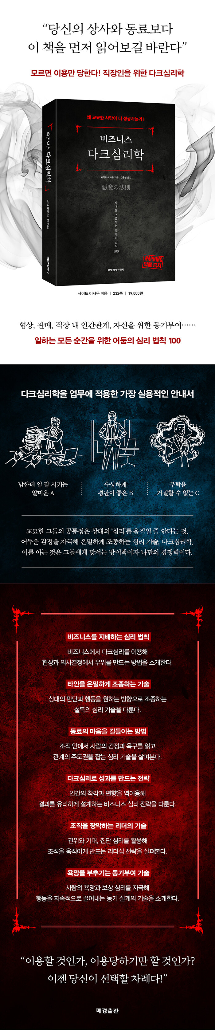 ¡¶ºñÁî´Ï½º ´ÙÅ©½É¸®ÇС·Àº Àΰ£ º»¼ºÀÇ ¾îµÎ¿î ¸éÀ» ÀÚ±ØÇØ Å¸ÀÎÀÇ °¨Á¤À» Á¶Á¾ÇÏ´Â ½É¸® ±â¼úÀ» ºñÁî´Ï½º ÇöÀå¿¡¼ ÀÌ¿ëÇÒ ¼ö ÀÖµµ·Ï Á¤¸®ÇÑ Ã¥ÀÌ´Ù. ±Ø½ÉÇÑ °æÀïÀ¸·Î °¡µæ Âù Á÷ÀåÀÎÀÇ ¼¼°è¿¡¼ ´Ü¼øÈ÷ ÁÖ¾îÁø ÀÏÀ» ÀßÇÏ´Â °ÍÀº °æÀï·ÂÀÌ µÉ ¼ö ¾ø´Ù. ¾Õ¼ ³ª°¡·Á¸é ³²µé°ú ´Ù¸¥ ÇÑ ²ýÀÌ ÇÊ¿äÇÏ´Ù. º°´Ù¸¦ °Í ¾ø¾î º¸ÀÌÁö¸¸ ³²µéº¸´Ù Æò°¡°¡ ÁÁÀº °æÀïÀÚ, À¯³È÷ °í°´°ú ²ö²öÇØ º¸ÀÌ´Â µ¿·á. ±×µéÀÇ ÁøÂ¥ °øÅëÁ¡Àº »ó´ëÀÇ ¡®½É¸®¡¯¸¦ Àаí ÀÌ¿ëÇÒ ÁÙ ¾È´Ù´Â °ÍÀÌ´Ù. »ç¶÷µéÀº ÀÚ½ÅÀÌ ¿ÂÀüÈ÷ ÀÚ½ÅÀÇ ÀÇÁö´ë·Î ¼±ÅÃÇϰí ÇൿÇÑ´Ù°í ¹Ï´Â´Ù. ±×·¯³ª »ç½Ç ¸»Åõ, ½Ã¼± °°Àº »ç¼ÒÇÑ ÀÚ±ØÀÌ °áÁ¤À» Á¿ìÇÑ´Ù. À̸¦ Àß ¾Æ´Â À̵éÀº ¼Õ½±°Ô »ó´ë¸¦ ¿òÁ÷¿© Á¦ ¶æ´ë·Î ÀÏÀÌ µ¹¾Æ°¡°Ô ¸¸µç´Ù.