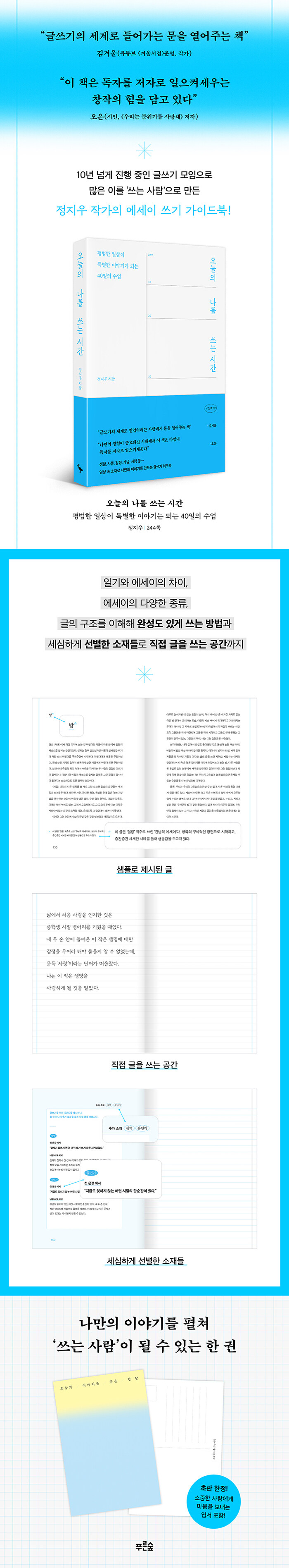 ÃÑ 3ºÎ·Î ±¸¼ºµÈ ÀÌ Ã¥Àº ±Û¾²±â ¹æ¹ý·ÐºÎÅÍ ½ÃÀÛÇØ ÀÚ½ÅÀÌ ¾´ ±ÛÀ» ŸÀΰú °øÀ¯ÇØ ¿¬°áµÇ´Â ¹æ¹ý±îÁö ¼¼¼¼ÇÏ°Ô ¾È³»ÇÑ´Ù. 1ºÎ¿¡¼´Â ¡®³ª¡¯¸¸ Àд ±ÛÀÎ Àϱâ¿Í ¡®³²¡¯µµ Àд ¿¡¼¼ÀÌÀÇ Â÷ÀÌÁ¡À» ¤¾îÁØ´Ù. ±×¸®°í ÇÑ ¹®Àå, ÇÑ ¹®´Ü, ÇÑ ÆíÀÇ ±ÛÀ» ¾î¶»°Ô ½á¾ß ÇÏ´ÂÁö ¾Ë·ÁÁØ´Ù. 2ºÎ´Â µ¶ÀÚ°¡ Á÷Á¢ ±ÛÀ» ¾²´Â °ø°£À» ¸¶·ÃÇß´Ù. ªÀº ±ÛÀ» ÇÊ»çÇÏ´Â °ÍÀÌ ¾Æ´Ñ, Àϻ󿡼 ¸¶ÁÖÇϰí Èê·Áº¸³»´Â Æò¹üÇÑ ¼ø°£À» ¼±º°ÇØ 40°³ÀÇ ¼ÒÀ縦 Á¦½Ã, »ùÇà ±ÛÀ» ÀÐ°í ¹è¿ì¸ç Á÷Á¢ ±ÛÀ» ¾²µµ·Ï µ¶·ÁÇÑ´Ù. 3ºÎ´Â ÀÌ·¸°Ô ¾´ ±ÛÀ» ¼¼»ó¿¡ ¼±º¸ÀÌ´Â ´Ù¾çÇÑ °æ·Î¸¦ ¼Ò°³ÇÑ´Ù. SNS, ´º½º·¹ÅÍ, °ø¸ðÀü, ÃâÆÇ»ç Åõ°í µî ±Û¾²±â¸¦ ÅëÇØ ŸÀΰú, ±×¸®°í ¼¼»ó°ú ¿¬°áµÇµµ·Ï µ½´Â´Ù.