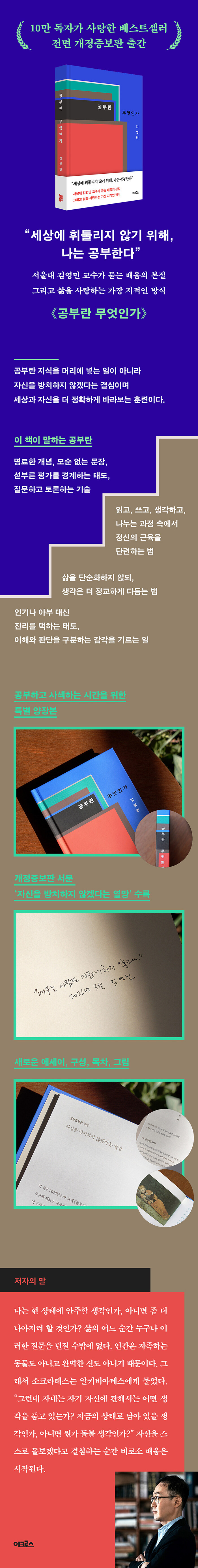 ¼¿ï´ë ±è¿µ¹Î ±³¼öÀÇ º£½ºÆ®¼¿·¯ ¡¶°øºÎ¶õ ¹«¾ùÀΰ¡¡·°¡ »õ·Î¿î ¿¡¼¼À̸¦ ´õÇÏ°í ±¸¼ºÀ» ´ëÆø °³ÆíÇÏ¿© °³Á¤Áõº¸ÆÇÀ¸·Î µ¹¾Æ¿Ô´Ù. ÀúÀÚ´Â ¼¹®¿¡¼ ¼ÒÅ©¶óÅ×½ºÀÇ ¸»À» ºô·Á ¿ì¸®¸¦ ¸ØÃç ¼¼¿ì°í ¹¯´Â´Ù. ¡°ÀÚ³×´Â Áö±ÝÀÇ »óÅ·Π³²¾Æ ÀÖÀ» »ý°¢Àΰ¡, ¾Æ´Ï¸é ¹º°¡ µ¹º¼ »ý°¢Àΰ¡?¡±