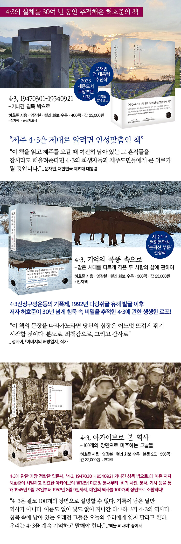 ƯÈ÷ 2023³â Ãâ°£ÇÑ ¡º4¡¤3, 19470301-19540921 ±â³ª±ä ħ¹¬ ¹ÛÀ¸·Î¡»´Â 4¡¤3ÀÇ ½Çü¿Í ±× Áø½ÇÀ» ¾Ë±â À§ÇÑ ÀÔ¹®¼·Î È®°íÇÏ°Ô ÀÚ¸®¸¦ ÀâÀ¸¸ç 4¡¤3¿¡ ´ëÇÑ µ¶ÀÚµéÀÇ °ü½ÉÀ» Á¤È®ÇÑ ¹æÇâÀ¸·Î À̲ø¾îÁÖ°í ÀÖ°í, 2024³â ´ë¸¸¿¡¼ ¡ºðñ¶ ÞÌ¡¤ß², Î¥êÆÙù, åÓßÓñËú¾á¦Í£¡»¶ó´Â Á¦¸ñÀ¸·Î ¹ø¿ª Ãâ°£ µÇ±âµµ Çß´Ù.