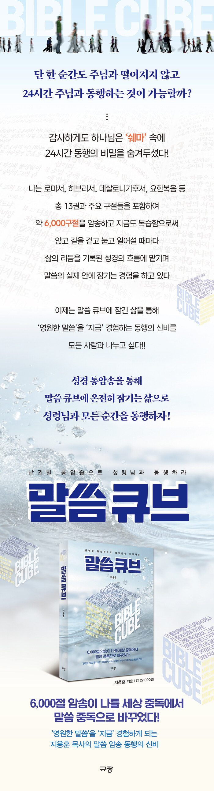 ÀÌ Ã¥Àº ÀúÀÚ°¡ ½ÇÁ¦·Î °æÇèÇÑ ¡®¸»¾¸ Å¥ºê ¾È¿¡ Àá±â´Â »î¡¯À» ±â·ÏÇÑ Ã¥ÀÌ´Ù. ÀúÀÚ´Â ¼º°æ ³¹±ÇÀ» Åë°·Î ¾Ï¼ÛÇÏ¸ç ±â·ÏµÈ ¸»¾¸ÀÇ È帧¿¡ »îÀÇ ¸®µëÀ» ¸Ã±â¸ç ¼º·É´Ô°ú µ¿ÇàÇÑ´Ù. ÀÌ È帧Àº ¾É¾Æ ÀÖÀ» ¶§»Ó ¾Æ´Ï¶ó ±æÀ» °È°í, ´¯°í, ÀϾ´Â ¸ðµç ¼ø°£À¸·Î À̾îÁø´Ù. 6,000±¸Àý ¾Ï¼ÛÀÚÀÎ ±×´Â ¿ì¸®°¡ ¸»¾¸À» ÀÌÇØ³ª ºÐ¼®ÀÇ ´ë»óÀ¸·Î »ï´Â °ÍÀÌ ¾Æ´Ï¶ó ¿ÏÀüÇϽŠÇϳª´ÔÀÇ ¸»¾¸ ±× ÀÚü¿¡ Àá°Ü »ì¾Æ°¥ ¶§ ¿µ¿øÇÑ ¸»¾¸ ±× ÀÚüÀ̽ŠÇϳª´ÔÀ» °æÇèÇÏ´Â µ¿ÇàÀÇ ½Åºñ¸¦ ´©¸®°Ô µÈ´Ù°í °Á¶ÇÑ´Ù. ±×·¸´Ù. Çϳª´ÔÀº ¿ì¸®°¡ Çϳª´Ô°ú ´Ã µ¿ÇàÇÒ ¼ö Àִ ŵµ¿Í ¹æ¹ýÀ» ÀÌ¹Ì Á÷Á¢ Á¦Á¤ÇسõÀ¸¼Ì´Ù. ¡°ÀÌ À²¹ýÃ¥À» ³× ÀÔ¿¡¼ ¶°³ªÁö ¸»°Ô Çϸç Á־߷Π±×°ÍÀ» ¹¬»óÇÏ¿© ±× ¾È¿¡ ±â·ÏµÈ ´ë·Î ´Ù ÁöÄÑ ÇàÇ϶󡱴 Çϳª´ÔÀÇ ¸í·É¿¡ µû¶ó ȸ°³Çϰí, ¸»¾¸À» ¼Ò¸®·Î ¼±Æ÷Çϰí, ¼øÁ¾Çϸç Çϳª´ÔÀ» ¿¹¹èÇÏ´Â °ÍÀÌ´Ù. ¿À´Ã³¯ ÀΰøÁö´ÉÀÌ ÇØ¼®Çϰí Á¤¸®ÇØÁÖ´Â ¸»¾¸ÀÌ ¾Æ´Ï¶ó, ÀÏÁ¤ÇÑ ¾Ë°í¸®Áò ¾È¿¡ °¤Çô ÀÖ´Â Á¦ÇÑµÈ ¸»¾¸ÀÌ ¾Æ´Ï¶ó, Çϳª´ÔÀÇ ÀÔÀ¸·ÎºÎÅÍ ³ª¿À´Â ¸ðµç ¸»¾¸À¸·Î »ì±â ¿øÇÏ´Â ºÐ, ¼º·É´Ô°ú µ¿ÇàÇÔÀ¸·Î ¼º·É°ú ÁöÇý°¡ Ãæ¸¸ÇÑ »îÀ» »ì±â ¿øÇÏ´Â ºÐµé¿¡°Ô Åë¾Ï¼Û°ú ÇÔ²² ÀÌ Ã¥ÀÇ Àϵ¶À» ±ÇÇÑ´Ù.