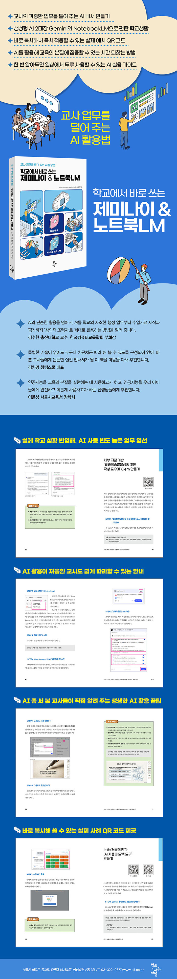 °úÁßÇÑ ¾÷¹«·Î ±³À°¿¡ ÁýÁßÇÒ ¼ö ¾ø´Â ±³»çµé¿¡°Ô ¾÷¹« ºÎ´ãÀ» ´ú°í ±³À° º»ÁúÀÇ ½Ã°£À» µÇã¾Æ ÁÙ ¼ö ÀÖ´Â AI Ȱ¿ë ¹æ¹ýÀ» ¾Ë·Á Áִ å. ¿À·£ ±â°£ ±³À°Çõ½ÅÀ» ÁÖµµÇØ ¿Â 6¸íÀÇ ±³»ç´Â »ý¼ºÇü AI 2´ëÀå Á¦¹Ì³ªÀÌ¿Í ³ëÆ®ºÏLM¸¦ »ç¿ëÇØ ¾÷¹« È¿À²À» ³ôÀÌ´Â ±¸Ã¼ÀûÀÎ ¹æ¹ýÀ» ¾È³»ÇÑ´Ù. ±³»ç¶ó¸é ´©±¸³ª ¼Õ½±°Ô ó¸®ÇÏ°í ½Í¾îÇÒ ¸¸ÇÑ ¾÷¹«¸¦, AI¸¦ Ȱ¿ëÇØ È¿°úÀûÀ¸·Î ó¸®ÇÏ´Â °úÁ¤À» ±¸Ã¼ÀûÀÎ ¿¹¸¦ µé¾î ¼³¸íÇÑ´Ù. »ç¾÷ °èȹ¼³ª °ø¹®¼ ¿ä¾àºÎÅÍ À¥ ½Ã½ºÅÛ ±¸Ãà±îÁö »óȲº°·Î Àû¿ëÇÒ ¼ö ÀÖ´Â ´Ù¾çÇÑ »ç·Ê Á¦½ÃµÇ¾î ÀÖ¾î¼ ½ÇÁ¦ ¾÷¹« ȯ°æ¿¡¼ À¯¿ëÇÏ°Ô Âü°íÇÒ ¼ö ÀÖÀ» °ÍÀÌ´Ù. ¸¹ÀÌ ½áº» »ç¶÷¸¸ ¾Æ´Â AI Ȱ¿ë Tip°ú ÇÁ·ÒÇÁÆ® ¹× ÀÚ·á ¿¹½Ã¸¦ QR ÄÚµå·Î Á¦°øÇÏ¿© ½±°Ô µû¶óÇÏ°í ¹Ù·Î ÇöÀå¿¡ Àû¿ëÇÒ ¼ö ÀÖÀ» °ÍÀÌ´Ù.