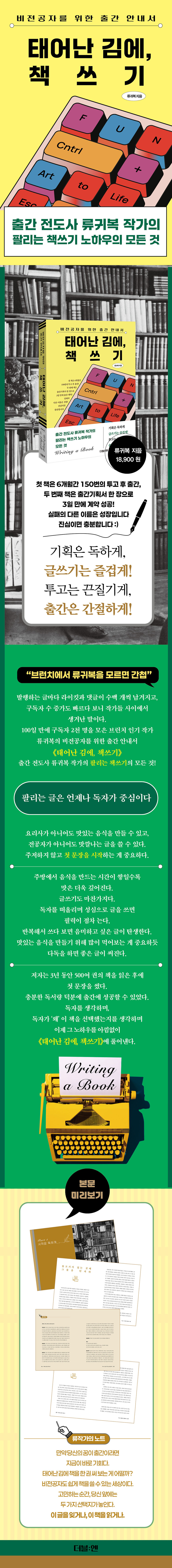 ±Û¾²±â´Â Áñ°Å¿ö¾ß ÇÏÁö¸¸, ±âȹÀº µ¶ÇØ¾ß ÇÑ´Ù. ¸·¿¬ÇÑ ²ÞÀÌ Çö½ÇÀÌ µÇ´Â ¼ø°£, ¡¶ÅÂ¾î³ ±è¿¡, Ã¥¾²±â¡·°¡ ±× ³ªÄ§¹ÝÀÌ µÇ¾îÁÙ °ÍÀÌ´Ù. Áö±¸ ¹Ý´ëÆí¿¡¼µµ ¹è¼Ûºñ¸¦ 3¹è³ª ³»°í ÁÖ¹®ÇÏ´Â ÀÌ Ã¥ÀÇ ¸Å·Â. ÀÌÁ¦ ´ç½ÅÀÌ ±× ÁÖÀΰøÀÌ µÉ Â÷·Ê´Ù. ½ÇÆÐ¸¦ ¡®¼ºÀ塯À¸·Î ¹Ù²Ù´Â ²öÁú±ä Åõ°íÀÇ ±â¼úÀ» Á÷Á¢ È®ÀÎÇØº¼ ¼ö ÀÖ´Ù. ±Û¾²±â¶ó´Â ¸Á¼³ÀÓÀÇ ´Ë¿¡ ºüÁø ´ç½Å¿¡°Ô ÀÌ Ã¥À» ±ÇÇÑ´Ù. ÀÌÁ¦´Â ¡®µ¶ÀÚ¡¯°¡ ¾Æ´Ñ ¡®ÀúÀÚ¡¯·Î ž Â÷·Ê´Ù.