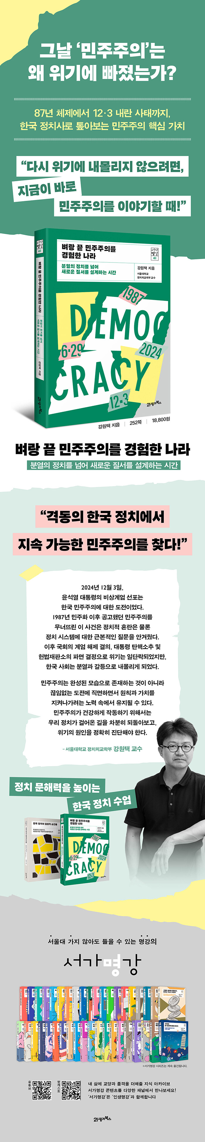 ÀÌ Ã¥Àº ¼¿ï´ëÇб³ Á¤Ä¡¿Ü±³Çкο¡¼ ÇлýµéÀ» °¡¸£Ä¡°í ¼¿ï´ë ±¹°¡¹Ì·¡Àü·«¿ø ¿øÀåÀ» Áö³»°í ÀÖ´Â °¿øÅà ±³¼ö°¡ 12¡¤3 ºñ»ó°è¾öÀ» °è±â·Î, Çѱ¹ ¹ÎÁÖÁÖÀÇÀÇ ÀÛµ¿ ¹æ½Ä°ú ¹ÎÁÖÁÖÀÇÀÇ °¡Ä¡¸¦ µÇµ¹¾Æº¸´Â µ¥¼ ½ÃÀ۵Ǿú´Ù. ÀúÀÚ´Â 1987³â 6¿ù Ç×Àï ÀÌÈÄ Çü¼ºµÈ Á¤Ä¡¡¤»çȸ Áú¼ÀÎ 87³â üÁ¦¸¦ ±âÁ¡À¸·Î ¿À´Ã³¯±îÁöÀÇ Çѱ¹ Á¤Ä¡°¡ ±×·Á³½ ¹ÎÁÖÁÖÀÇ ÁöÇüÀ» ¤¾î³»°í, ÀÌÈÄÀÇ Á¤Ä¡ °³Çõ ¹æÇâÀ» ã´Â´Ù. »õ·Î¿î Á¤±Ç Ãâ¹ü ÀÌÈÄ ³»¶õÀ» Á¾½ÄÇϰí, ±¹¹ÎÀ» ÅëÇÕÇÏ´Â ÀÏÀÌ Áß´ëÇÑ °úÁ¦·Î ¶°¿À¸¥ Áö±Ý, ¡®¹ÎÁÖÁÖÀÇ¡¯´Â °ú¿¬ ¿ì¸®¿¡°Ô ¾î¶² ÀǹÌÀϱî?