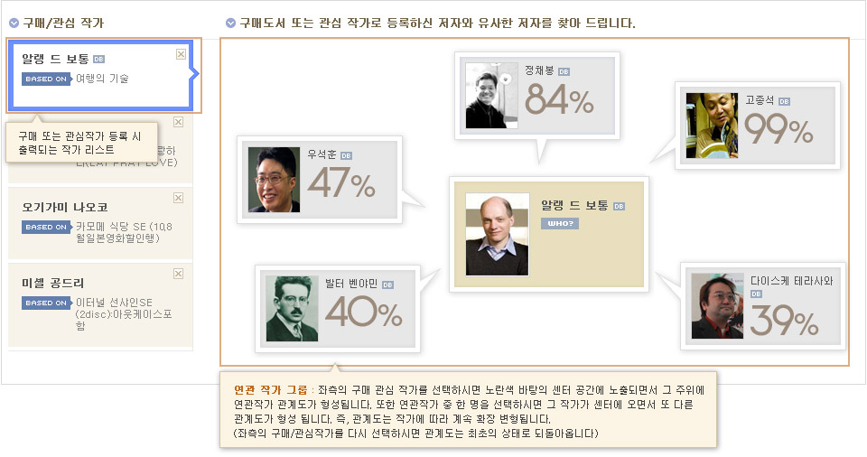ÃÖ±Ù¿¡ ±¸¸ÅÇϽеµ¼(ÃÖ´ë 15±Ç)ÀÇ ÀúÀÚ¿Í ¿¬°ü¼ºÀÌ ÀÖ´Â ´Ù¸¥ ÀúÀÚ ¸ñ·ÏÀ» °ü°èµµ ÇüÅ·Πº¸¿©µå¸®¸ç ÀÛǰ ¼ºÇâÀÌ ¼·Î À¯»çÇϰųª ÇÔ²² ±¸¸ÅµÇ´Â °æÇâÀÌ ³ôÀº µµ¼ÀÇ ÀÛ°¡°¡ ¿¬°ü ÀÛ°¡·Î ºÐ·ùµË´Ï´Ù. ±¸¸Å ³»¿ªÀÌ ¾ø¾îµµ ¡®¼³Á¤¡¯ ¸Þ´º¸¦ ÅëÇØ °ü½É ÀÛ°¡·Î µî·ÏÇÏ½Ã¸é ±× ÀÛ°¡ÀÇ ¿¬°ü ÀÛ°¡¸¦ È®ÀÎÇÏ½Ç ¼ö ÀÖ½À´Ï´Ù.