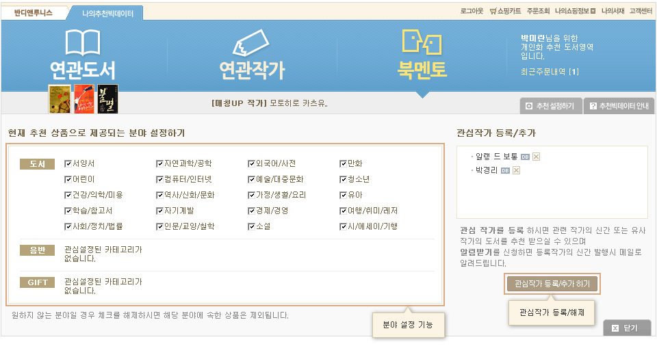 °ü½É ºÐ¾ßÀÇ »èÁ¦/Ãß°¡´Â ÆäÀÌÁö ¿ìÃø »ó´Ü ¡®¼³Á¤¡¯ ¸Þ´ºÀÇ ¡®Ãßõ ºÐ¾ß ¼³Á¤¡¯ ¿¡¼ ÇÏ½Ç ¼ö ÀÖ½À´Ï´Ù.